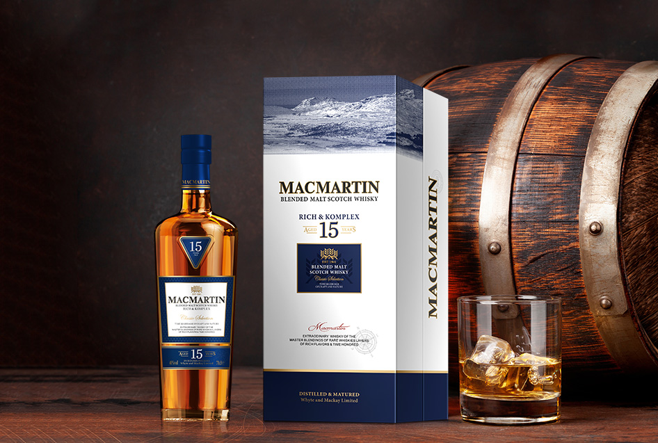 MACMARTIN BLENDED MALT SCOTCH WHISKY 15 YO is an exquisit of the complete processes of making an precious whisky. Characterised by its deep amber color, fragrant notes of creamy vanilla, dry frutis and marmalade combined with the oaky flair. Rich in layers and fuesd in perfect harmony.